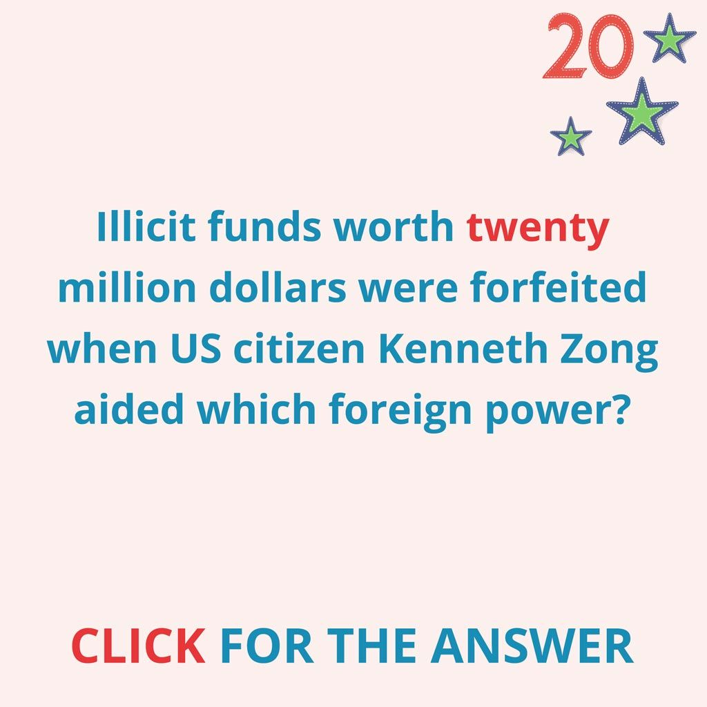 Illicit funds worth $20 million were forfeited when US citizen Kenneth Zong aided which foreign power?